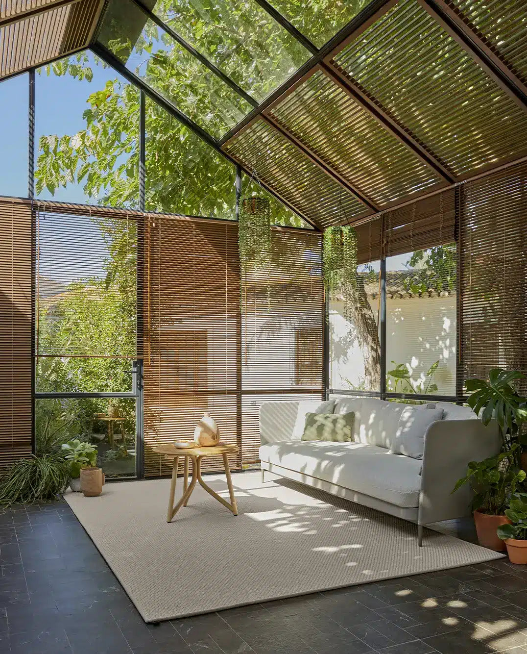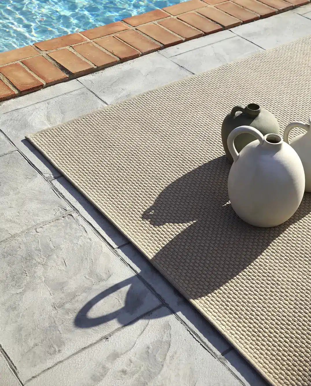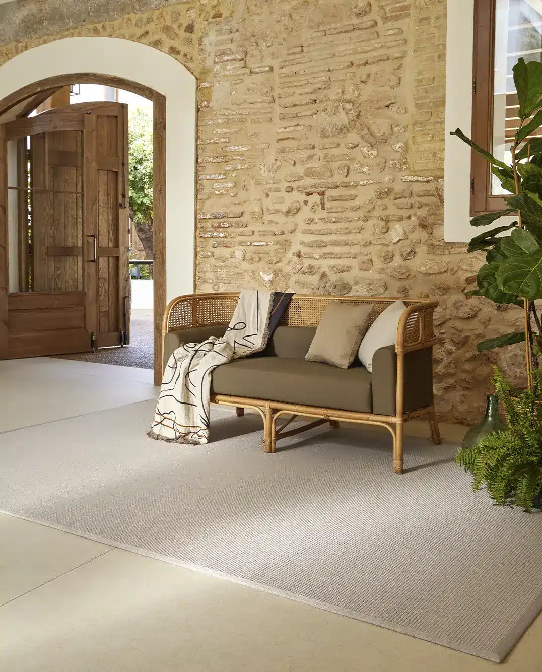 Nuestras alfombras para exterior poseen aspecto de fibras naturales como el sisal o yute pero están preparadas para colocar en zonas al aire libre. Poseen tratamiento UV incorporado, son resistentes al agua y de fácil mantenimiento. Las colecciones Terra, Maya y Nat.Premium están fabricadas a partir de PET reciclado proveniente de botellas de plástico.